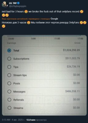 29 июля 2025 года, в день своего 18-летия, Lil Tay запустила профиль на OnlyFans, где за несколько часов заработала более миллиона долларов. Хотя в интернете появлялись фейковые «сливы» с её фото, достоверных откровенных материалов не существует. Lil Tay остаётся фигурой, которая сумела построить медийную карьеру через социальные сети и провокационный образ, вызывая продолжающийся интерес и обсуждения.